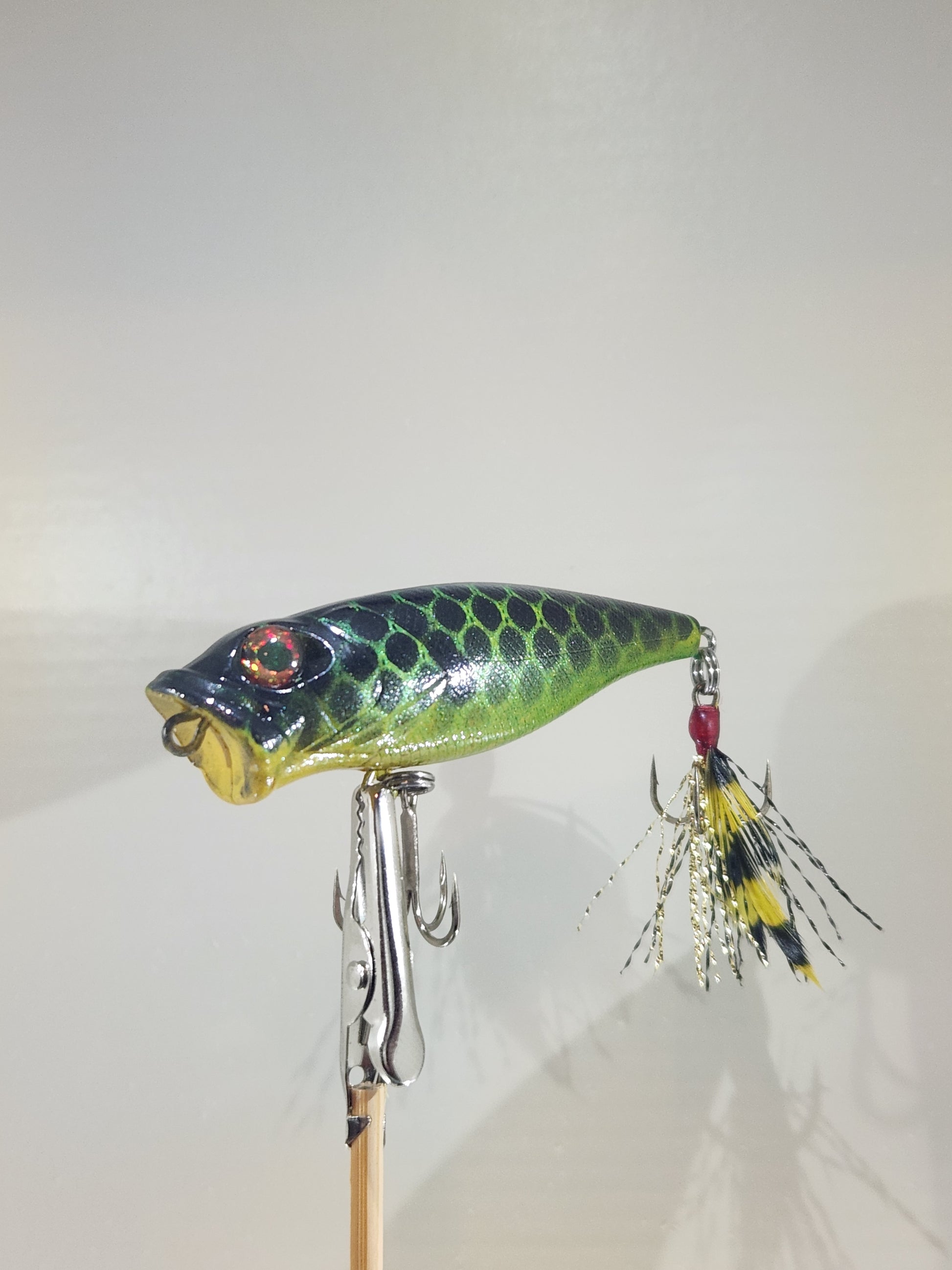 Shad meets sunfish meets frog. The "Sunburst" pattern on this popper makes it a great topwater for imitating a variety of prey! 2.5 inches, 1/4oz. Hand tied feather treble hook for added attraction!
